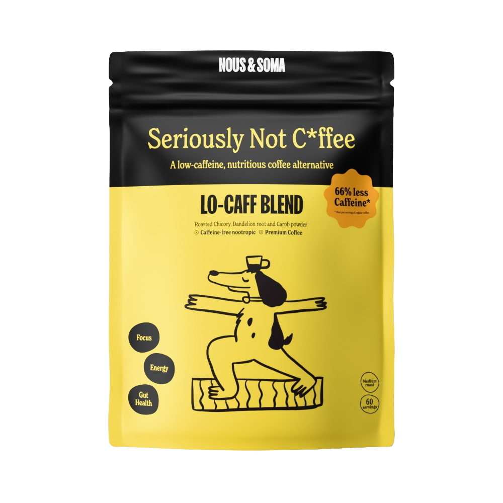 Nous & Soma Lo-Caff Blend is a coffee alternative that contains 66% less coffee than your regular coffee and has good for you ingredients such as Carob, Chicory, Dandelion, Enxtra and B Vitamins that have some serious benefits for you.